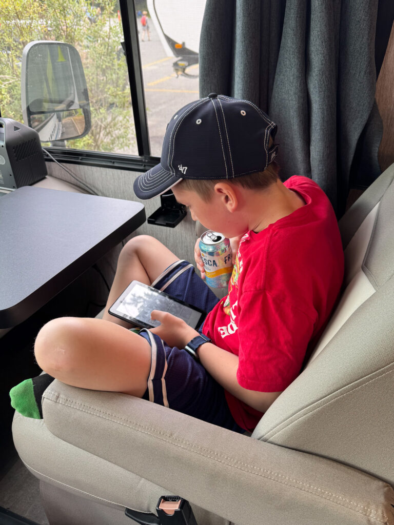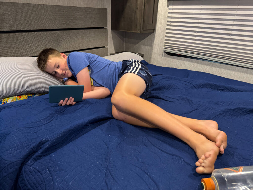 Once back from the gorge we ate lunch and then Rob needed to do some work. The boys and Kelly opted to relax on the back bed together. In the boys’ eyes the most magical thing happened. Kelly fell asleep, meaning with silence they could have unlimited screen time researching yachts (Cooper) and electric bikes and airplanes (Nicholas). The kids spent so much time in bed reading today that we are pretty sure they got bedsores. Nicholas’ happy reading place is in the front seat and, Cooper’s is on the back bed.